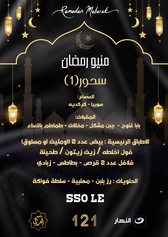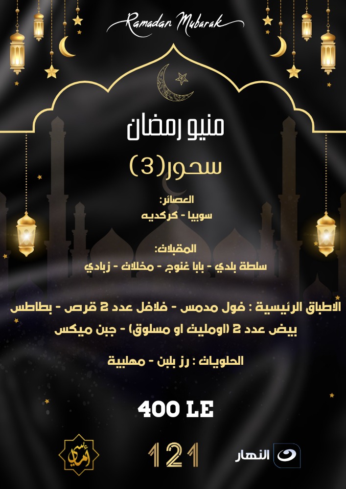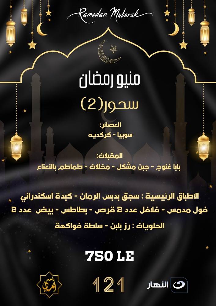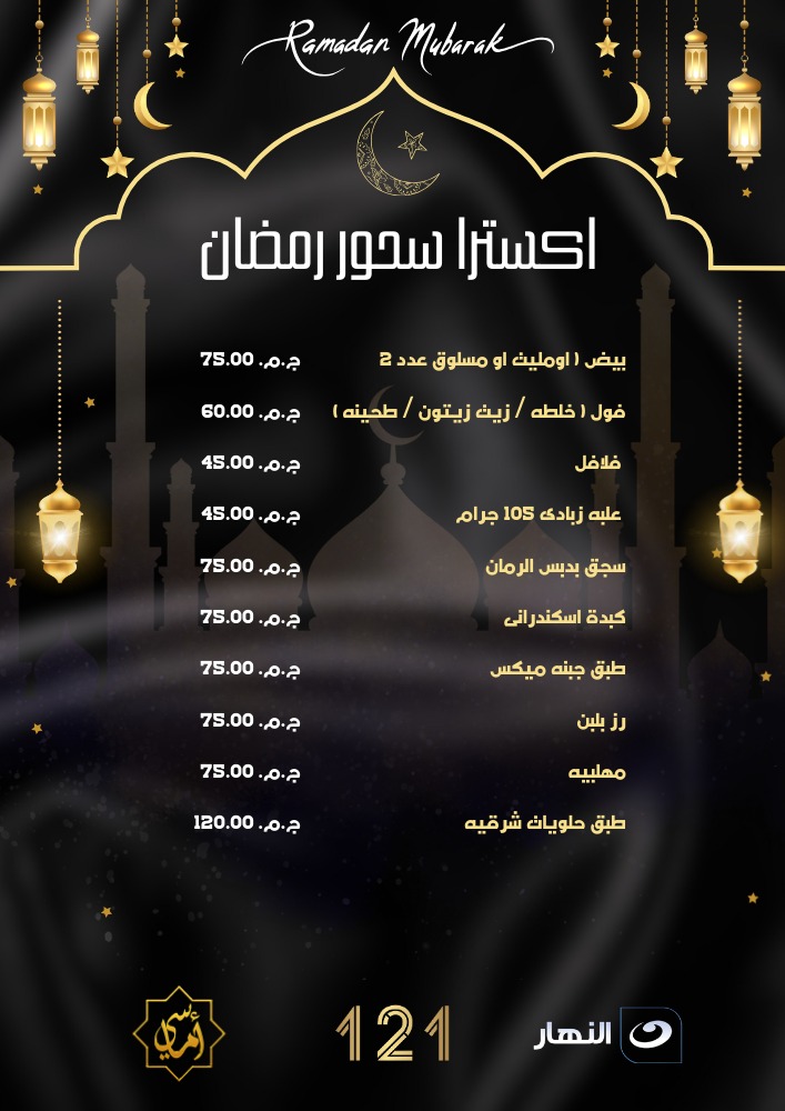 رمضان مبارك منيو سحور رمضان مطعم 121ن النيل يتمنى لكم رمضان مبارك سعيد . الاطفال أقل من 4 ىت سنوات مجانا والأطفال من سن 4 ح 10 سنوات بنصف الثمن 121 nile We wish you a pleasant suhoor